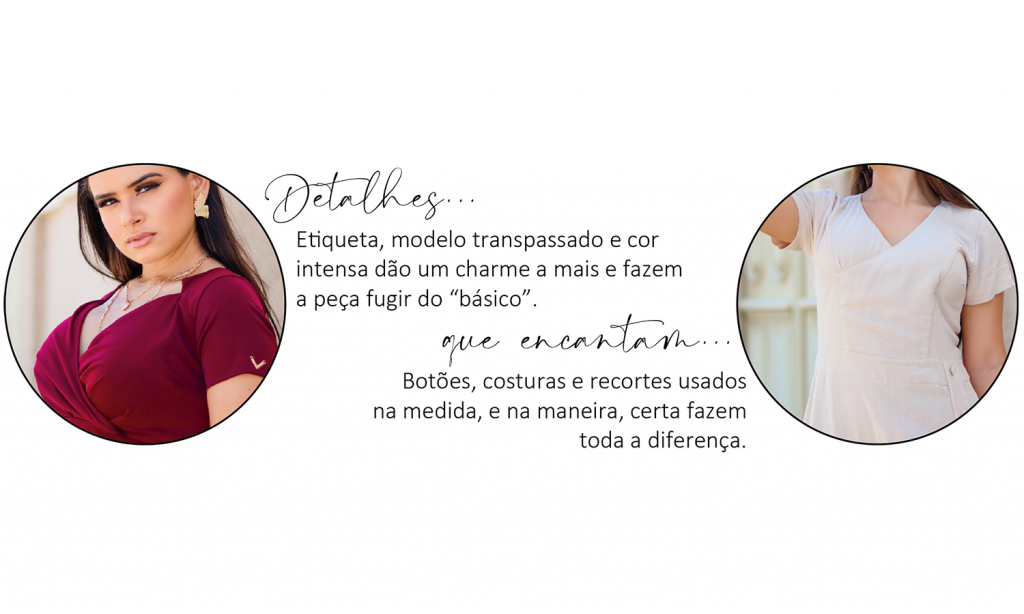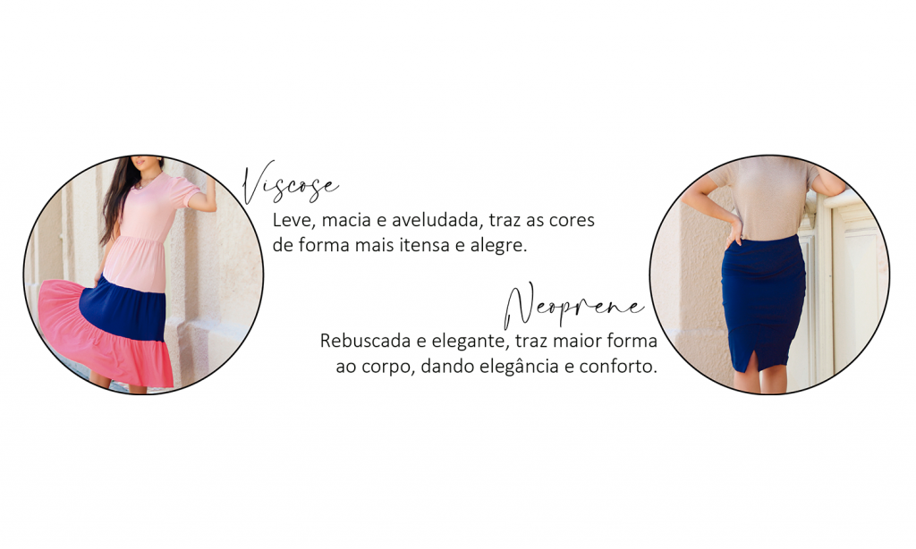 Quando o assunto é tecido, usamos a viscose e o neoprene. O primeiro tem características semelhantes aos tecidos de algodão, porém apresenta um toque melhor, mais aveludado. Também possui um caimento muito interessante e leve, uma textura gostosa e cores mais intensas. O neoprene, por sua vez, também conhecido como scuba, é mais encorpado, mas não perde no aspecto textura. Sua alta elasticidade permite que os nossos modelos se adequem a todos os tipos de corpo, trazendo elegância, charme e conforto.